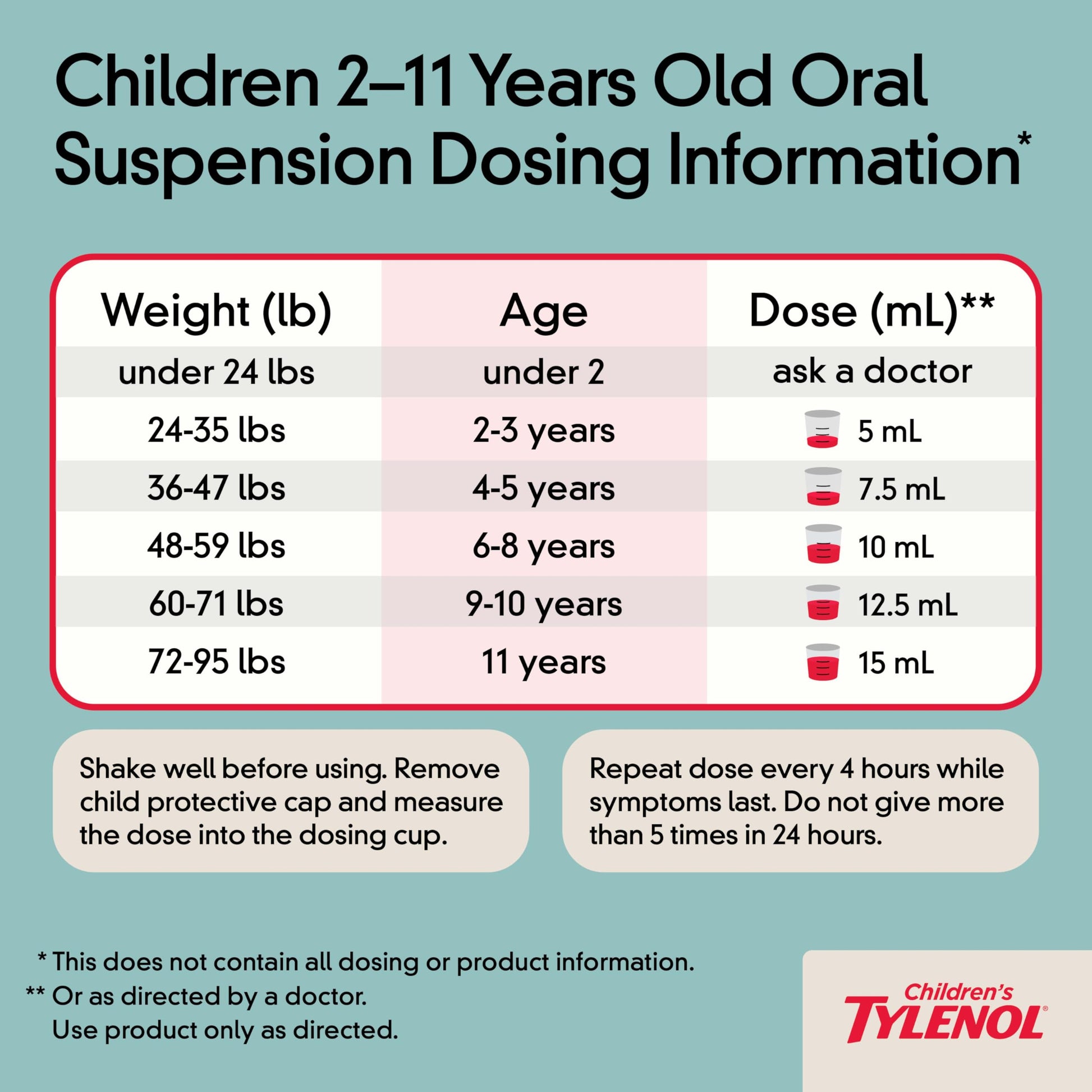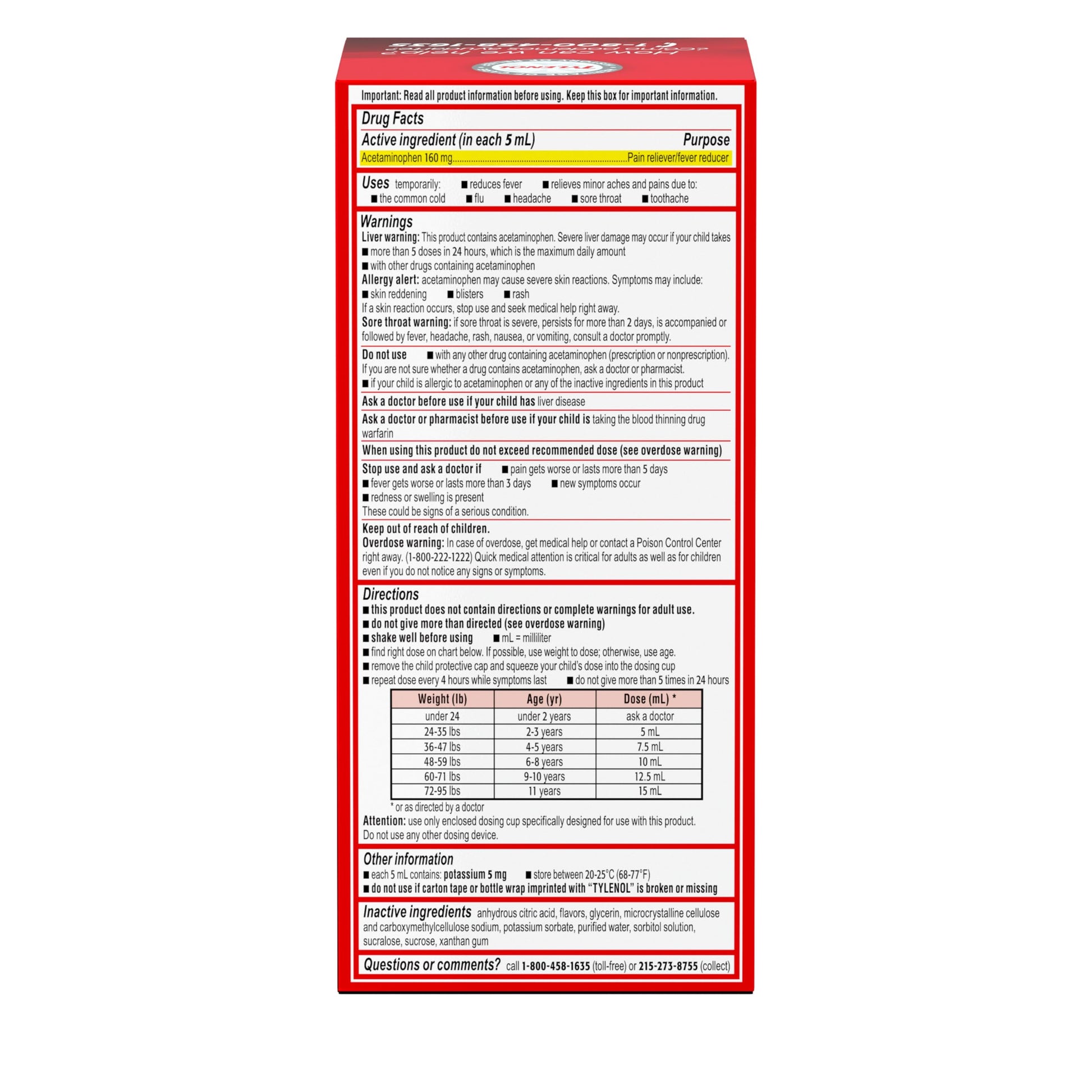 Details: Intended for kids ages 2 to 11 years, Children's Tylenol Liquid Oral Suspension Medicine with Acetaminophen in a Dye-Free Cherry flavor provides temporary relief from a range of cold and flu symptoms, including fever, minor aches and pains, toothache, headache and sore throat. Each 5- milliliter dose of this kids' liquid medicine contains 160 milligrams of the pain reliever and fever reducer acetaminophen to temporarily reduce fever and help relieve minor aches and pains due to the common cold and flu. This children's cold and flu symptom medicine also comes in a kid-friendly dye-free cherry flavor and is high fructose corn syrup-free, ibuprofen-free, aspirin-free, paraben-free and alcohol-free, and is gentle on the tummy. From the #1 pediatrician recommended brand for pain and fever relief, Children's Tylenol has been used by parents decade after decade for effective symptom relief.