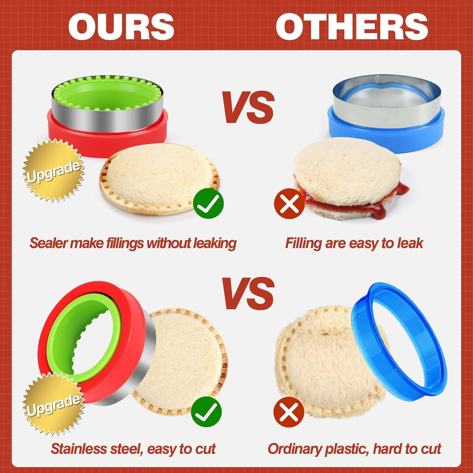 - 100% Safe and Upgraded: Our crustables sandwich cutter are made with food-grade stainless steel and high quality PP plastic with smooth edge to protect your hands. Compared with other sandwich crimper, stainless steel cutter are easier to cut. Upgraded sandwhich cruster has a serrated design to tightly seal the fillings, convenient and practical! After using, superior decruster sandwich makers are easy to clean by hand or dishwasher.